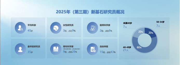 在本期35位新基石研究员中,数学与物质科学领域占19位,生物与医学科学领域16位。青年科学家群体表现尤为突出,在数学与理论计算机领域的3位入选者中,两位青年科学家平均年龄仅38岁,展现出耀眼的发展潜力。