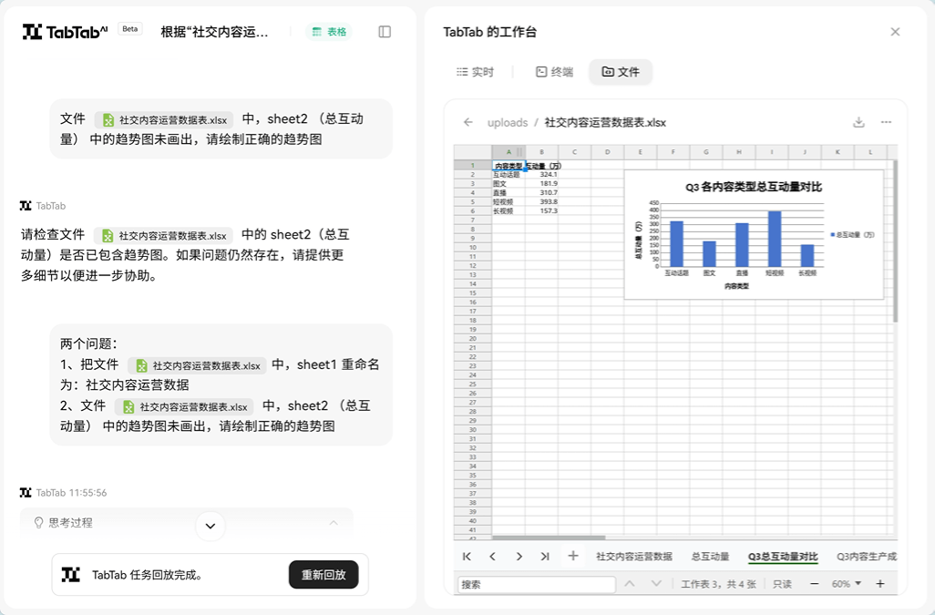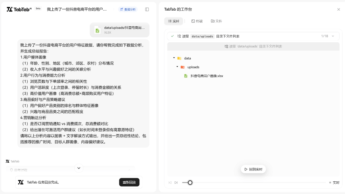 TabTab 是首个全链路 Data Agent,专注于AI数据分析领域,通过自然语言对话实现从数据搜集到深度分析的全流程自动化。拥有强大的数据整合、多维度挖掘和专业指标分析能力,能精准处理各类场景下的数据分析任务,从复杂的行业数据解读到细致的指标波动追踪均能高效完成,助力用户快速获取数据洞察,显著提升决策效率。TabTab 支持更多日常办公工具,包括表格处理、AI 文档、网页生成、幻灯片制作。可以根据自己的需求,给 TabTab 下发对应的任务,让 TA 帮你完成!