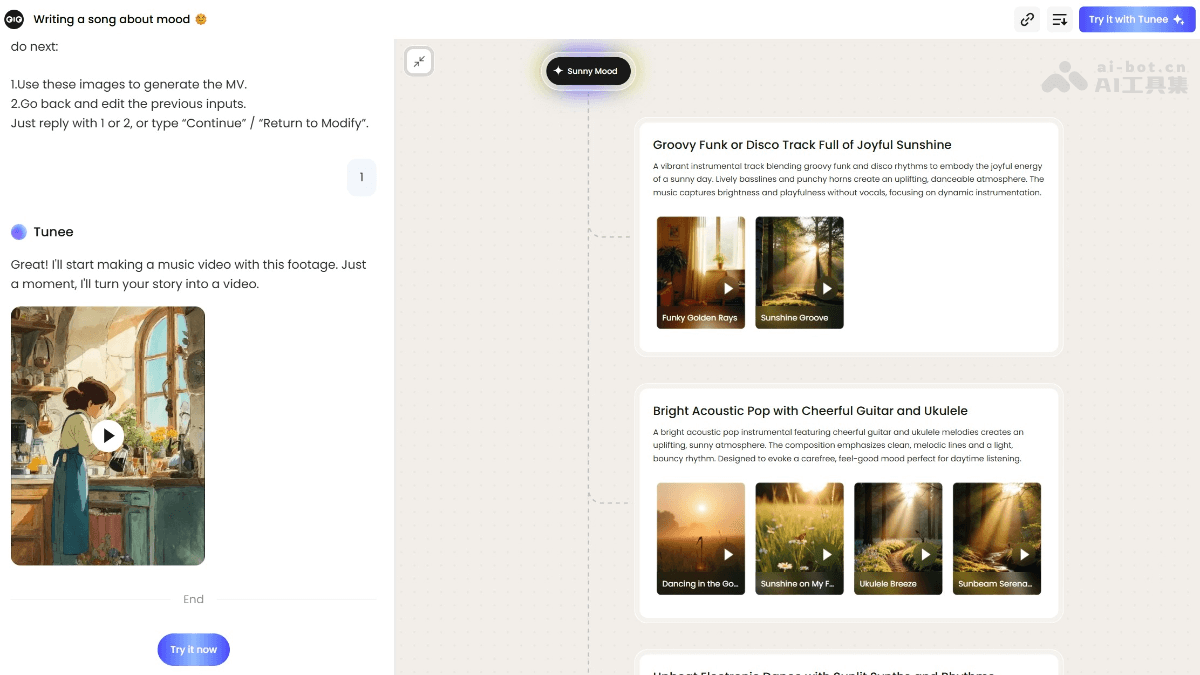 对话式音乐创作:用户可以通过自然语言描述自己的音乐想法,如“悲伤但充满希望”“像健身歌曲一样充满能量”等,Tunee 能生成符合描述的原创音乐作品。提供三种生成模式: