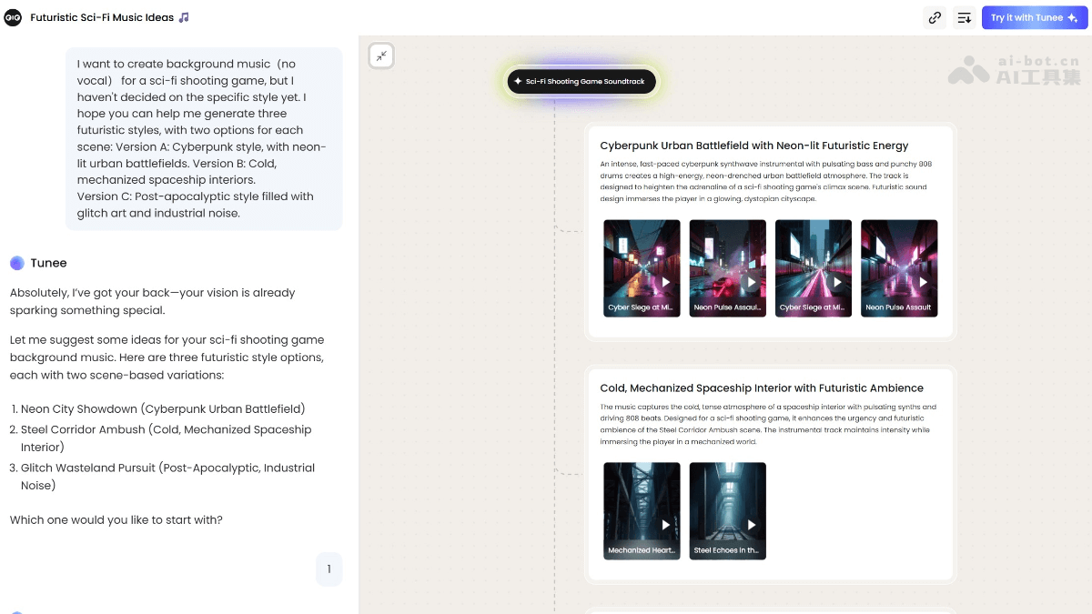 示例二:I want to create background music(no vocal) for a sci-fi shooting game, but I haven’t decided on the specific style yet. I hope you can help me generate three futuristic styles, with two options for each scene: Version A: Cyberpunk style, with neon-lit urban battlefields. Version B: Cold, mechanized spaceship interiors. Version C: Post-apocalyptic style filled with glitch art and industrial noise.