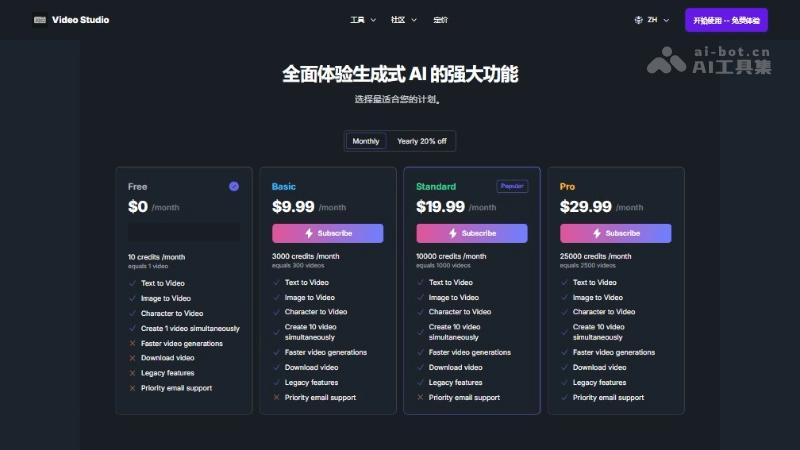 - 免费计划:每月提供 10 积分,相当于可以生成 1 个视频。功能包括文本到视频、图像到视频、角色到视频。同时只能创建 1 个视频。
